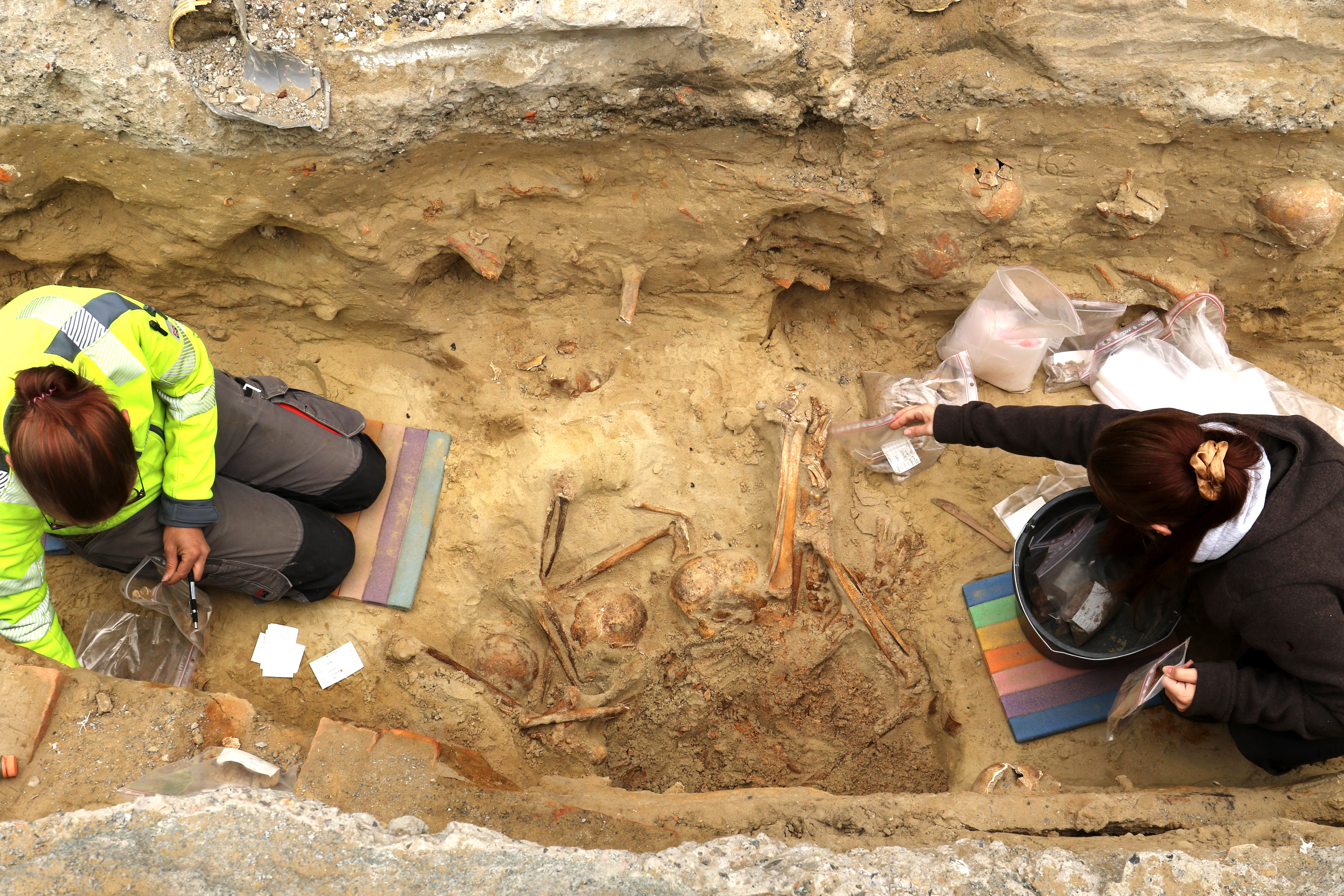 Cimetière de l’hôpital Saint-Jean, dégagement en cours d’inhumations en fosse commune - ©urban.brussels